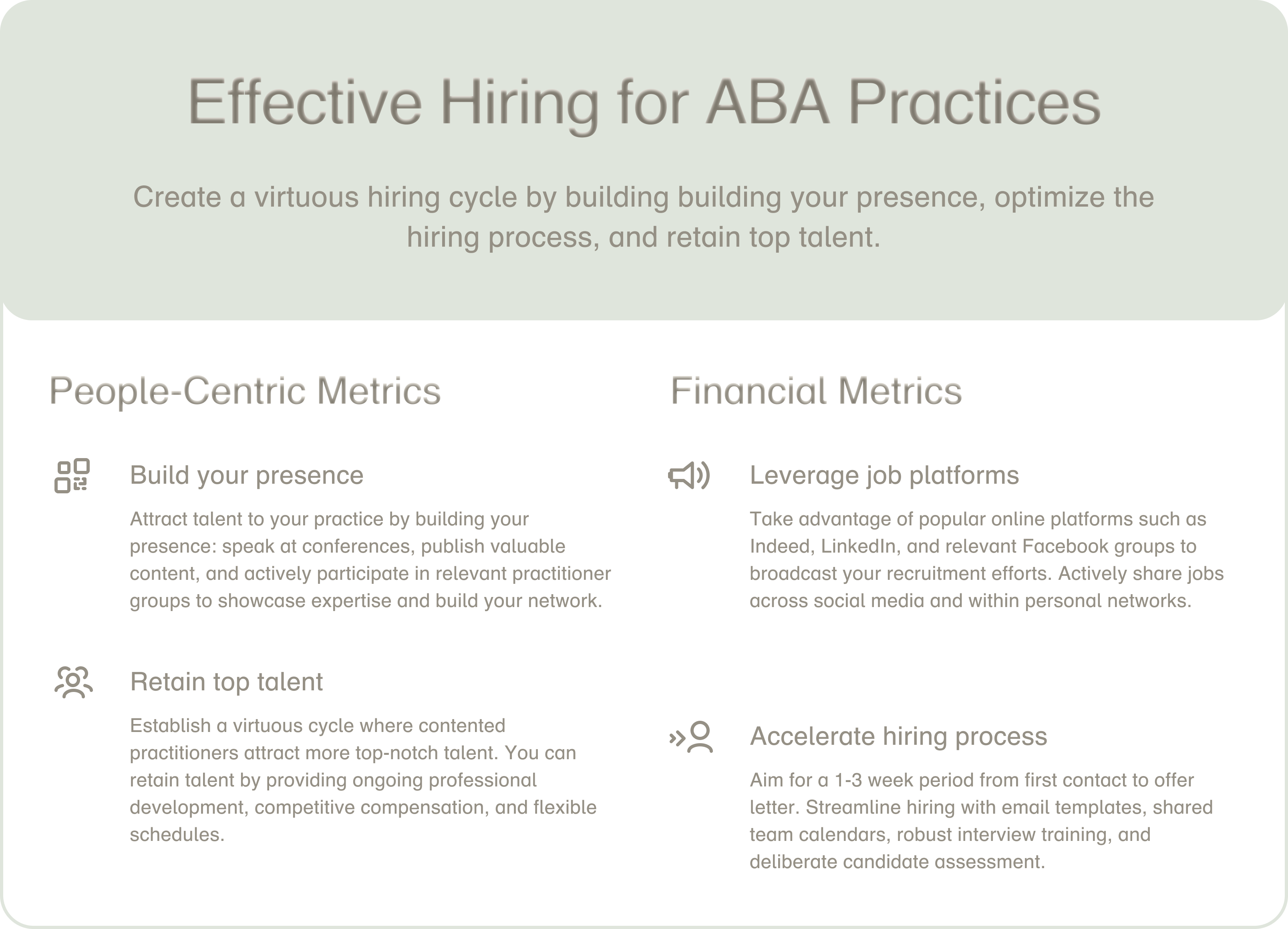 - Ensuring a sustainable workforce encompasses building a solid presence in the ABA community, optimizing the hiring process, and retaining top talent.